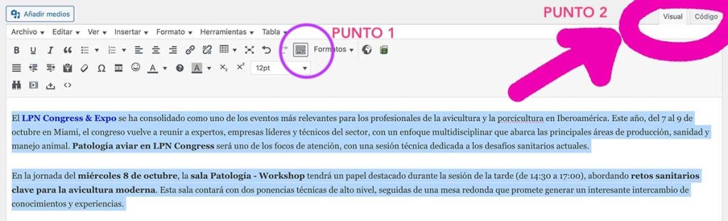 En los portales puedes usar el modo Visual o el modo Código ver “PUNTO 2”.